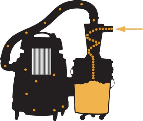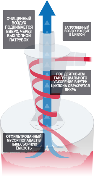 Воздух, перемешанный с частицами мусора (еще его называют "поток"), поступает во входное отверстие бокового патрубка циклонного фильтра (боковой патрубок циклона часто называют "тангенциальным"). Внутри циклонного фильтра воздух с частицами мусора приобретает вращательное движение по нисходящей спирали и движется вниз по направлению к пылесборной емкости. Во время такого винтообразного движения потока внутри корпуса циклона одновременно происходят два очень важных процесса: